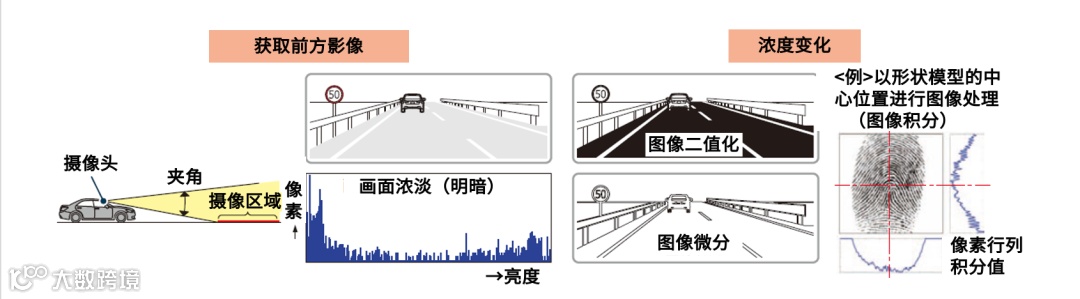 从经过处理的图像上抽取对应的候补点,寻找由各点分布构成的直线、曲线、平面等任意图形,按照特定的模板推定标识。通过标识信息进行判断并控制车辆。