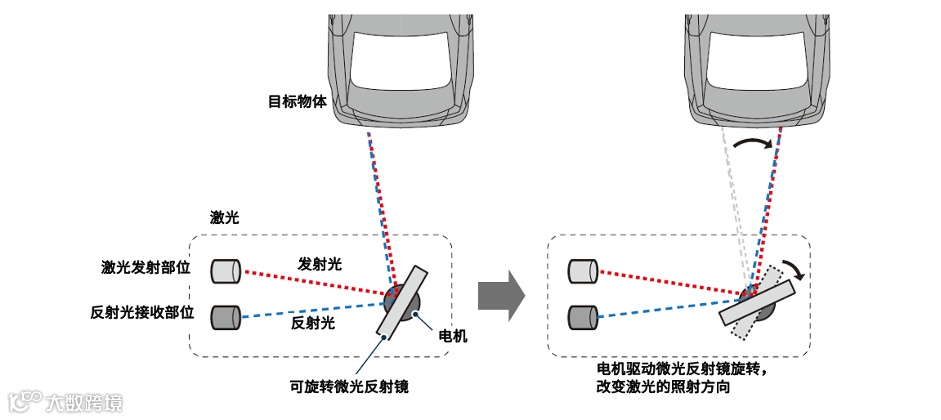 通过可旋转MEMS微光反射镜改变发射光束的方向,对特定范围进行扫描。目标物体会反射扫描光束,接收部件会识别反射光。通过发射激光和接收到反射光的时间,可以测定与目标物体间的距离以及目标物体的大小。