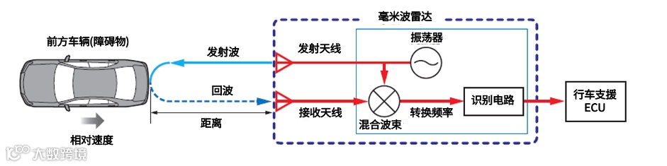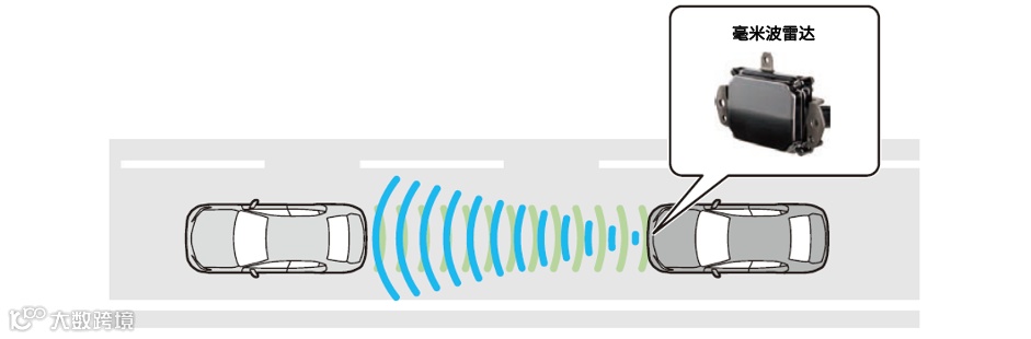 毫米波雷达是通过毫米波段的电波测量距离、相对距离、方向等的雷达传感器。在驾驶过程中向前方发射毫米波段的电波,若前方有车辆,则可收到反射回来的回波。通过分析检测到的反射波频率变化等,检测前方及对面是否有车辆、与前方及对面车辆间的距离、相对速度和方向等。
