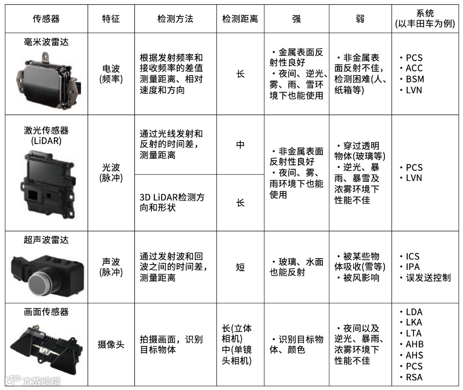 摄像头传感器,顾名思义就是通过摄像头拍摄车辆周边场景,并以此来识别车辆、行人、行车线等的传感器。从拍摄到的影像可以检测出车辆及车灯、行车道的白线及标识、行人及自行车等。
