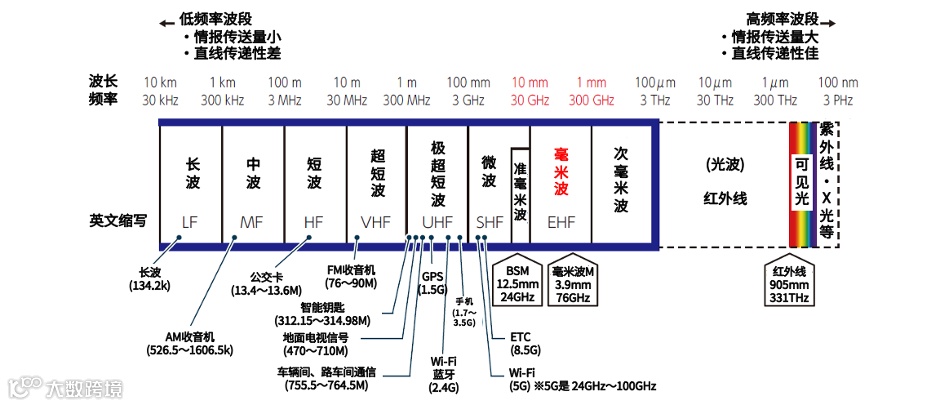 车辆上搭载的毫米波雷达通常使用两个波段。毫米波雷达使用的是76GHz波段的电波(毫米波*1)。BSM使用的是24GHz波段的电波(准毫米波)。