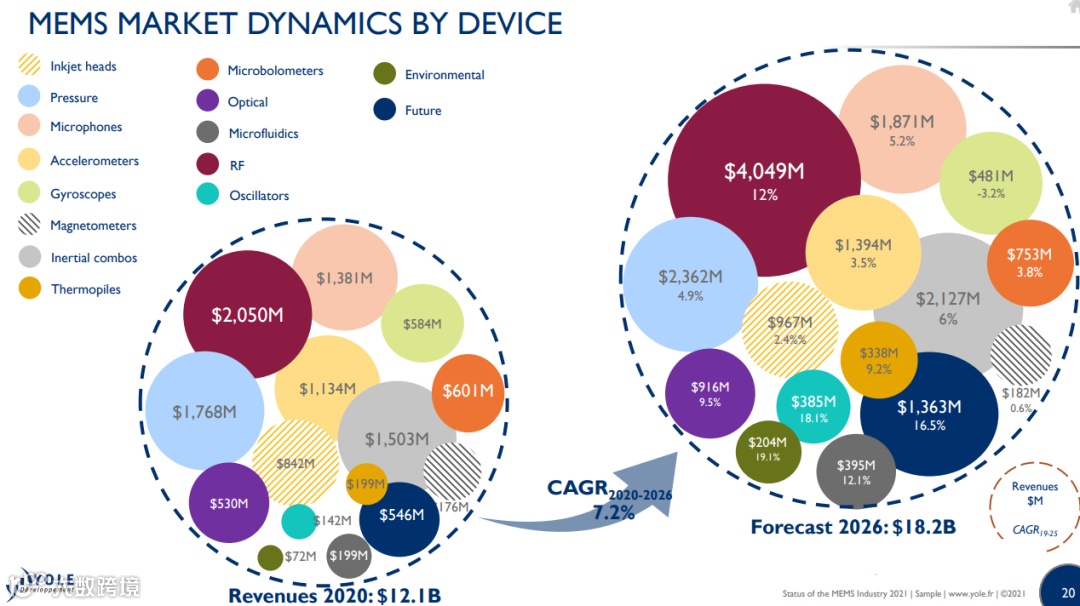 从MEMS器件方面来看,Yole预计,整体MEMS器件市场在2020年至2026年将以7.2%的年复合增长率增长,到2026年全球MEMS器件市场空间将达到182亿美元。在这其中,射频MEMS器件占大头,到2026年射频MEMS器件大约有40.4亿美元的市场空间,压力MEMS器件大约是23.62亿美元,惯性器件约有21.27亿美元,麦克风MEMS约是18.71亿美元,然后是加速器、喷墨头、光学、微型测辐射热仪、陀螺仪、微流体等等。