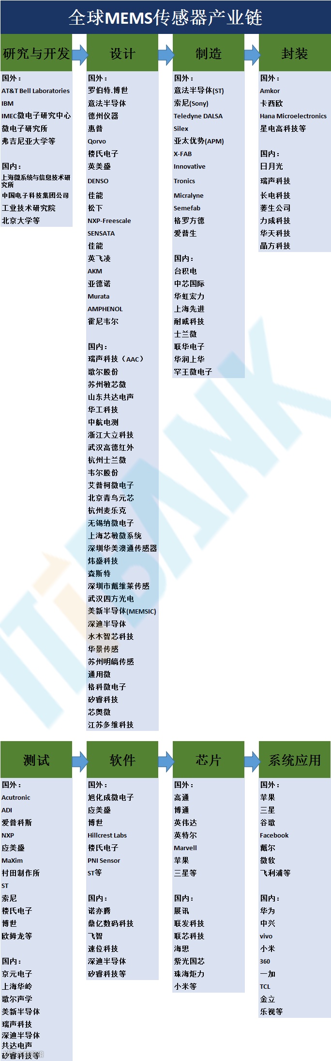 从上游到下游,全球MEMS传感器产业链可分为研究与开发→设计→制造→封装→测试→软件→芯片→系统/应用等环节。