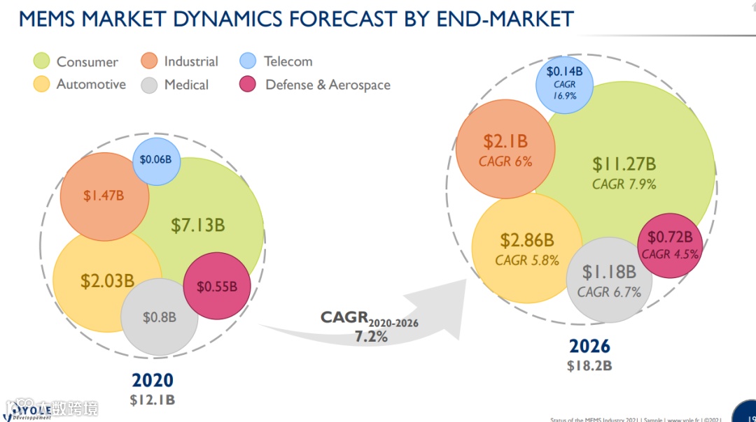 据Yole的预计,2020-2026年MEMS终端市场将以7.2%的年复合增长率增长。其中,消费领域是最大的MEMS应用市场,约占全球 MEMS 收入的 60%,到2026年约有112.7亿美元的市场。其次是汽车,汽车对MEMS的需求将从2020年的20.3亿美元上升到28.6亿美元。剩下的应用市场还有工业领域、医疗、电信、国防与航空航天等。