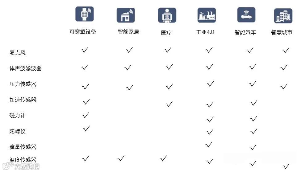MEMS 技术在可穿戴设备、智能家居、医疗、工业4.0、智能汽车、智慧城市等IOT 细分领域都有广泛的应用,常见的MEMS 传感器诸如麦克风、体声波滤波器、压力传感器、温度传感器等都存在丰富的应用场景。