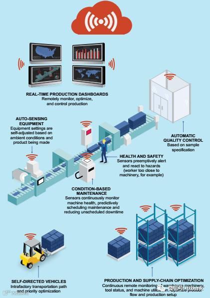 智能工厂利用物联网技术加强信息管理和服务,掌握产销流程、提高生产过程的可控性、减少生产线上人工的干预、及时正确地采集生产线数据,以合理的安排生产计划与生产进度,并优化供应链。传感器应用非常广泛,工业生产各个环节都需要传感器进行监测,并把数据反馈给控制中心,以便对出现异常节点进行及时干预,保证工业生产正常进行。