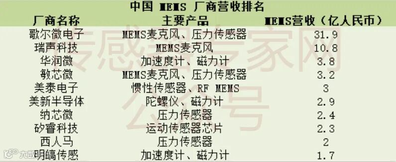 中国厂商MEMS业务营收相比全球巨头仍有一定差距,歌尔微电子MEMS业务营收约31亿元、瑞声科技11亿元、高德红外5.6亿元,为中国MEMS营收前三甲企业。