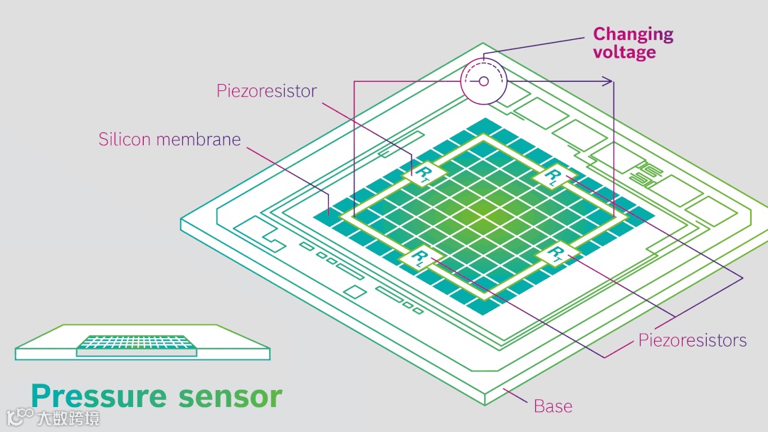 下图是一种MEMS电阻式压力传感器的工作动图,由一个带有硅薄膜的底座和安装在其上的电阻结构组成,当外力施加时,电压与压力大小成比例变化产生测量值。