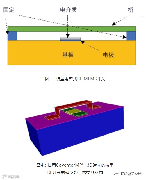 在操作过程中,力被施加到像桥一样悬在基板上的梁。当梁被该力(例如静电力)拉下时,会接触到基板上的电介质,使信号终止。桥型电容开关的横截面如图 3 所示,其中使用CoventorMP® 3D所建的电容式RF MEMS开关模型处于未变形状态,如图 4 所示。