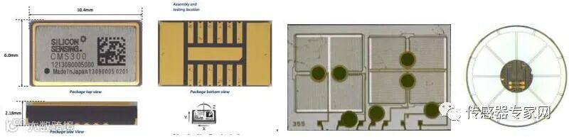下图是Silicon Sensing Systems推出的一款惯性组合传感器(左)和MEMS芯片(右),包括一颗ASIC芯片,一颗MEMS陀螺仪芯片和一颗加速度计芯片,采用陶瓷基板和引线键合。