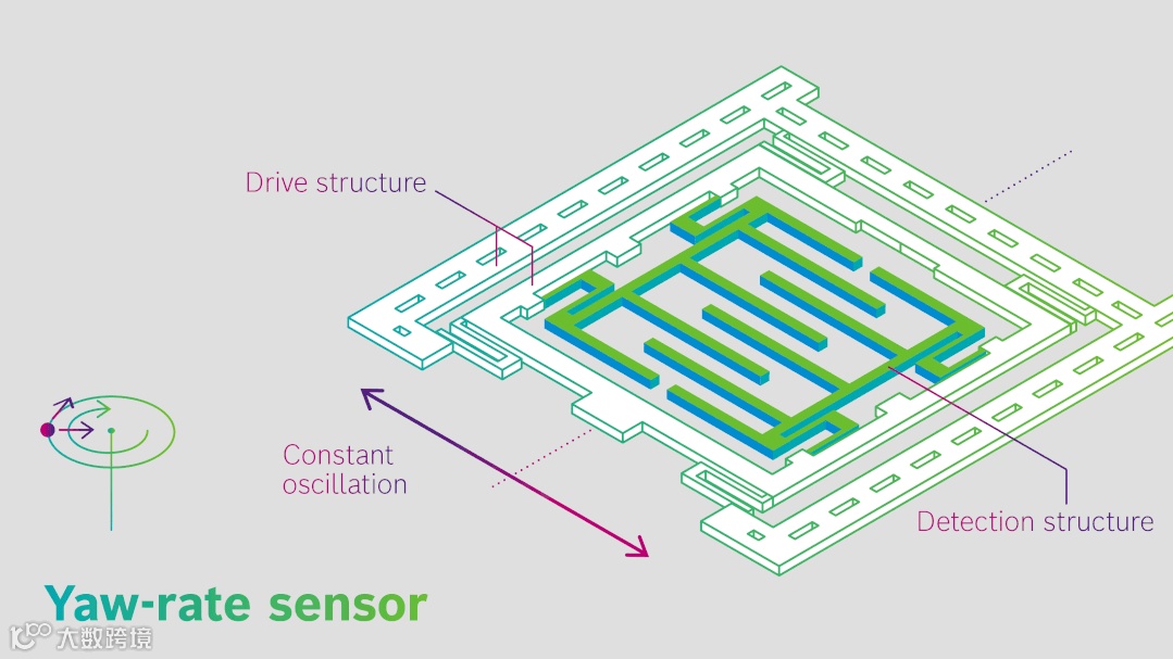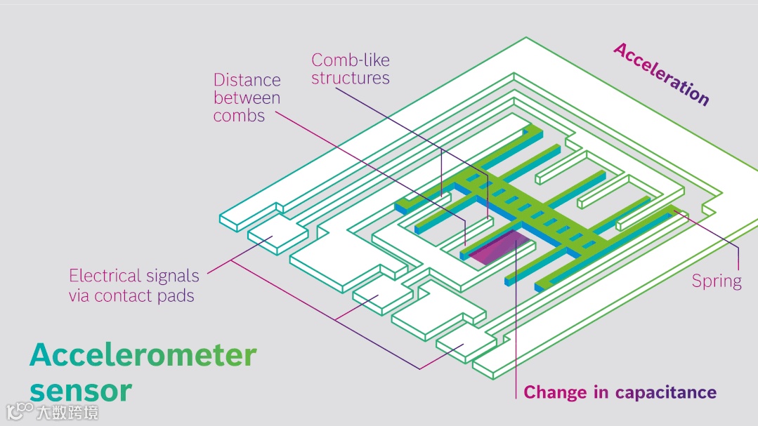 下图来自博世,但物体产生加速度时,带动梳妆结构产生位移,使梳妆结构间电容改变,从而测量出加速度值。