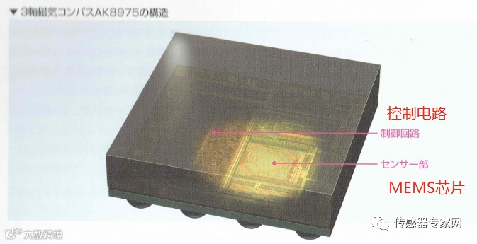 下图是一个3轴MEMS磁传感器封装结构图,包含MEMS芯片和控制电路。