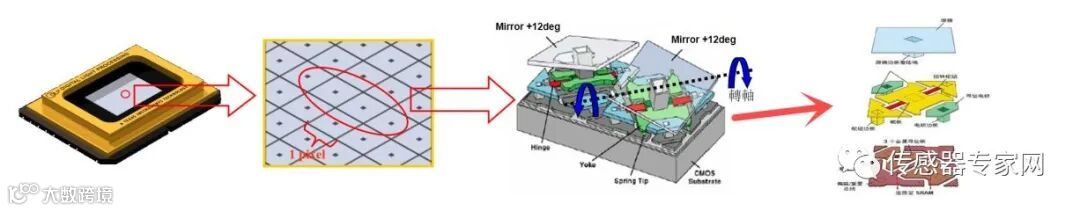 下图是DMD芯片每一个微镜翻转,折射光线的过程,每一片微镜都可以单独控制,折射相应的光线,从而形成不同的色彩、明暗,每一个微镜就如同我们电视的每一个像素点。