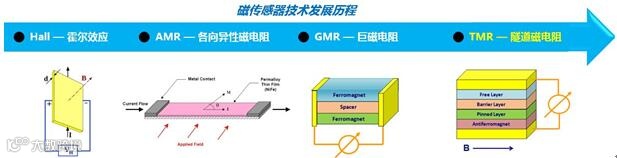 磁传感器主要分为四大类,霍尔效应(Hall Effect)传感器、各向异性磁阻(AMR)传感器、巨磁阻(GMR)传感器和隧道磁阻(TMR)传感器。