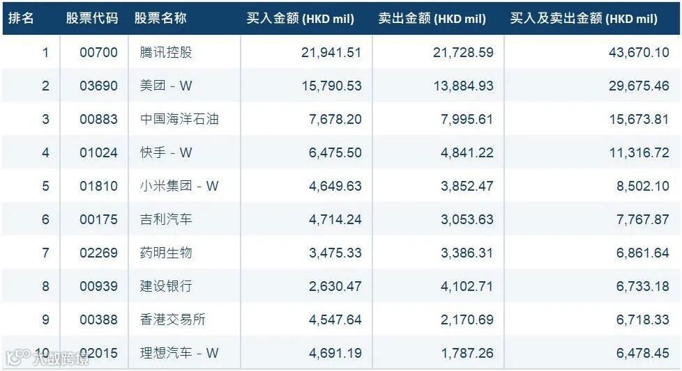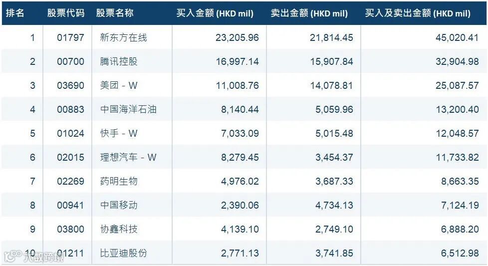 成交活跃股票方面,港股通(沪)南下资金前三大成交股为腾讯控股(700)、美团-W(3690) 和中国海洋石油(883) ;而港股通(深)南下资金前三大成交股为新东方在线(1797) 、腾讯控股(700)和美团-W(3690)。