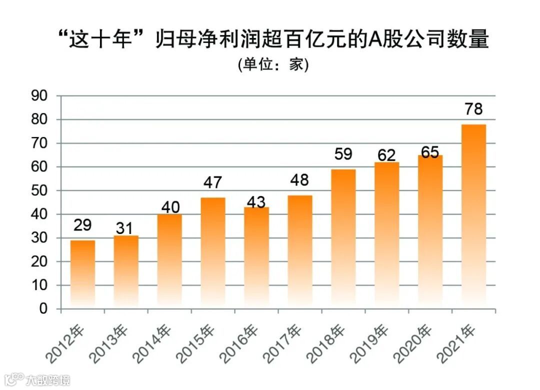 数据显示,2012年归母净利润超百亿元的A股公司数量为29家,2021年达到78家,十年间归母净利润超百亿元的A股公司数量增长168.97%。