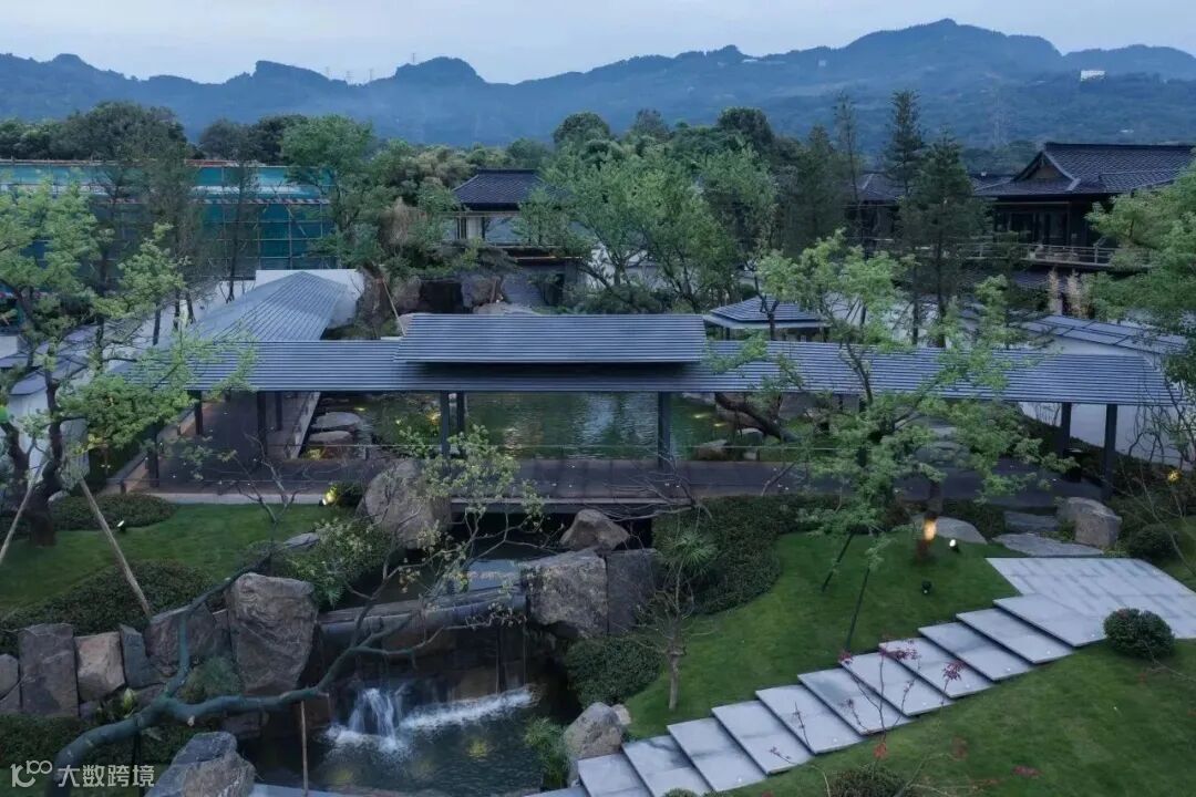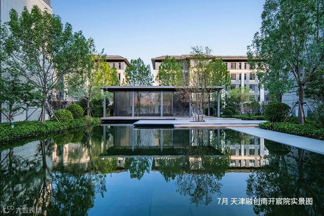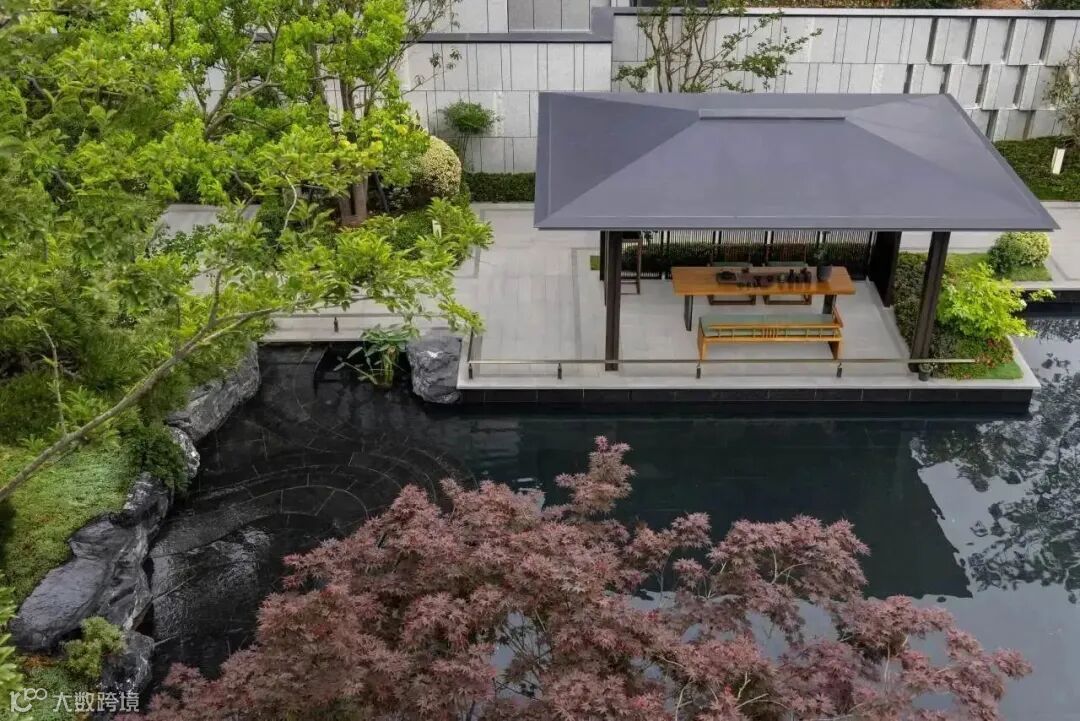 融创以园林化、艺术化手法造园,通过廊、桥、庭、阁的巧妙运用来表达与加深对中国传统文化的理解,又通过几何构图、植物和水系的搭配赋予景观艺术气息。过程中,追求观赏性与功能性的有机结合,用景观园林为社区注入绿意盎然的生命力,营造人与自然和谐共生的诗意氛围。