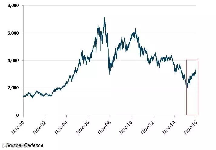现在距离上个资源热潮已有12年,自上次崩盘有9年。2016年一月,澳交所的资源股指数由大约2000点“触底反弹”,截至到去年11月市场整体上扬超50%。