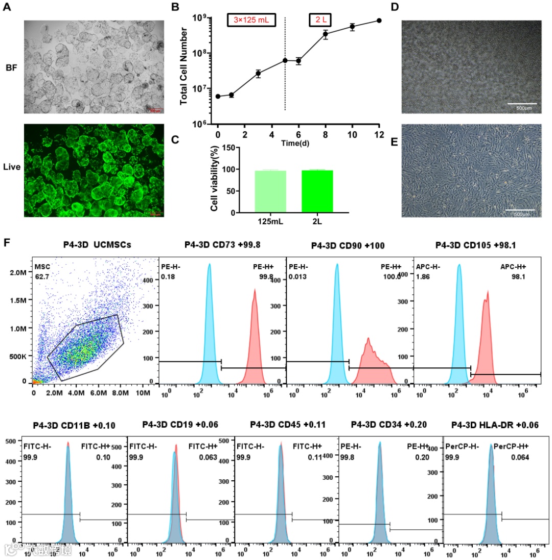 首先,对收获的3D-MSCs进行了系列基础生物学属性检测。结果显示,3D仿生微载体可支持hUC-MSCs高效附着与增殖(Fig 2A);125mL和2L生物反应器收获的细胞活力均超95%,最终能获得高产量细胞(Fig 2B-C);微载体裂解后残留达标且无可见碎片(Fig 2D),3D培养的hUC-MSCs能够保持梭形成纤维细胞形态(Fig 2E)及标准抗原表型(高表达 CD73、CD90、CD105,低表达 CD11b、CD19、CD45、CD34、HLA-DR阴性标志物)(Fig 2F)。综上,3D仿生微载体培养系统在提升hUC-MSCs的附着能力和增殖效率的同时,能维持细胞的优良形态和标准表型表达。