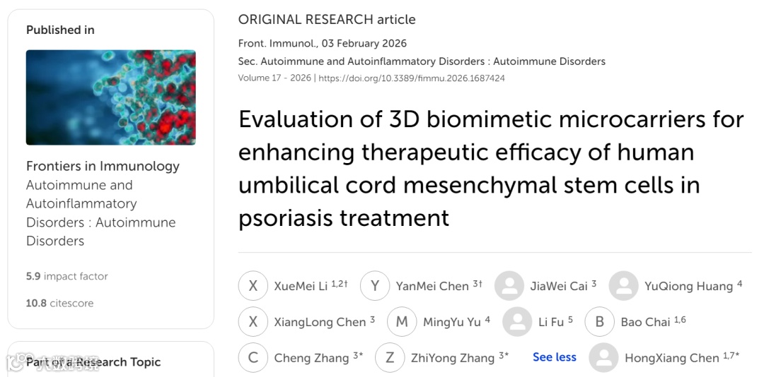 银屑病作为影响全球 2%-3%人口的慢性炎症性皮肤病,以异常角质形成细胞增殖和免疫细胞浸润为核心特征,现有生物治疗易出现复发、耐药等问题,亟需更安全有效的治疗策略。2026年2月3日,深圳市南山区人民医院陈宏翔教授联合中科睿极首席科学家张智勇教授团队在国际权威免疫学期刊《Frontiers in Immunology》发表题为“Evaluation of 3D biomimetic microcarriers for enhancing therapeutic efficacy of human umbilical cord mesenchymal stem cells in psoriasis treatment(基于3D微载体-生物反应器系统增强hUC-MSCs对银屑病的治疗效果)”的研究论文,创新性地将3D微载体-生物反应器系统应用于人脐带间充质干细胞(hUCMSCs)的培养,显著增强了其对银屑病的治疗效果,为银屑病治疗领域带来新突破!