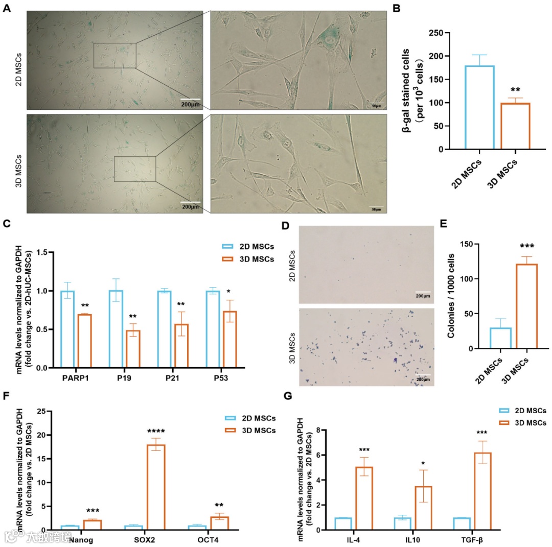 继续评估2D与3D培养的hUC-MSCs在细胞衰老、活力、多能性及免疫调节因子表达方面的差异。经β-半乳糖苷酶染色分析,3D-MSCs衰老细胞占比未升高(Fig 4A-B);且衰老相关标志物 PARP1、P19、P21、P53 的 mRNA 表达水平显著低于 2D-MSCs(Fig 4C)。3D-MSCs的成纤维细胞集落形成单位(CFU-F)数量较2D-MSCs显著增加(Fig 4D-E)。RT-qPCR 检测显示,3D-MSCs中多能性标志物 OCT4、SOX2、NANOG的 mRNA 表达水平高于2D-MSCs(Fig 4F)。3D-MSCs中免疫调节及抗炎因子 IL-4、IL-10、TGF-β 的 mRNA 表达水平显著升高,表明其抗炎和免疫调节能力更优(Fig 4G)。综上,3D 培养条件可有效减少 hUC-MSCs 的衰老,增强其增殖活力、多能性及免疫调节功能,优于传统2D培养方式。