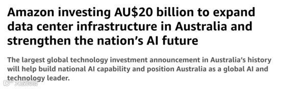 作为全球数一数二的跨境电商巨头,亚马逊自然不会落后。将在2025-2029年间投资200亿澳元用于扩大、运作和维护在澳洲的数据中心,提升澳洲的人工智能能力。