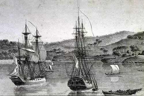 1802 年6月20日,法国探险队抵达悉尼港进行休整,殖民地政府给予船队以热情的接待,并向他们出售了 60 桶面粉、25 桶咸肉,以及一艘30吨位的纵帆船。