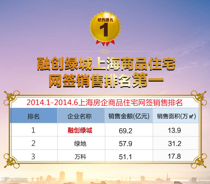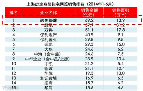 2014年上半年,融绿上海区域以69.2亿元排名全市商品住宅网签销售金额冠军,远超第二名11.3亿元。上海及苏锡常地区共完成合约销售额106.99亿元。
