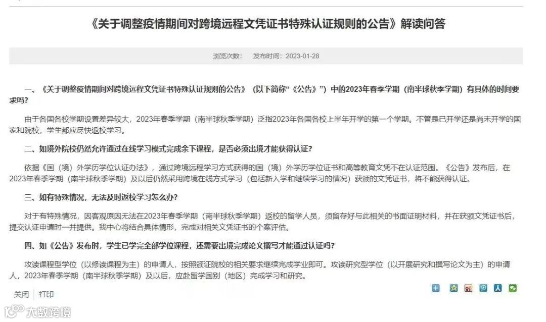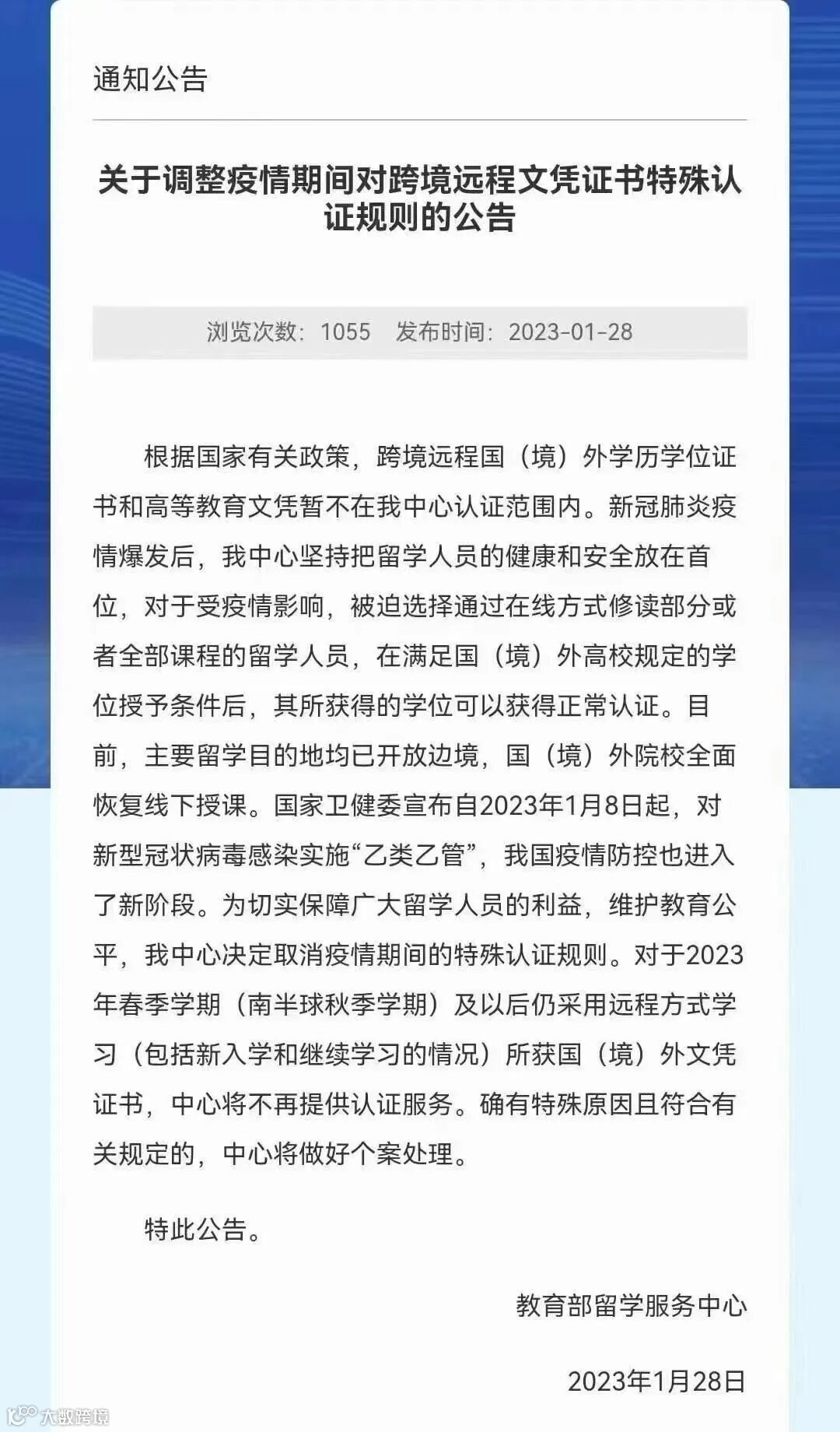 《关于调整疫情期间对跨境远程文凭证书特殊认证规则的公告》