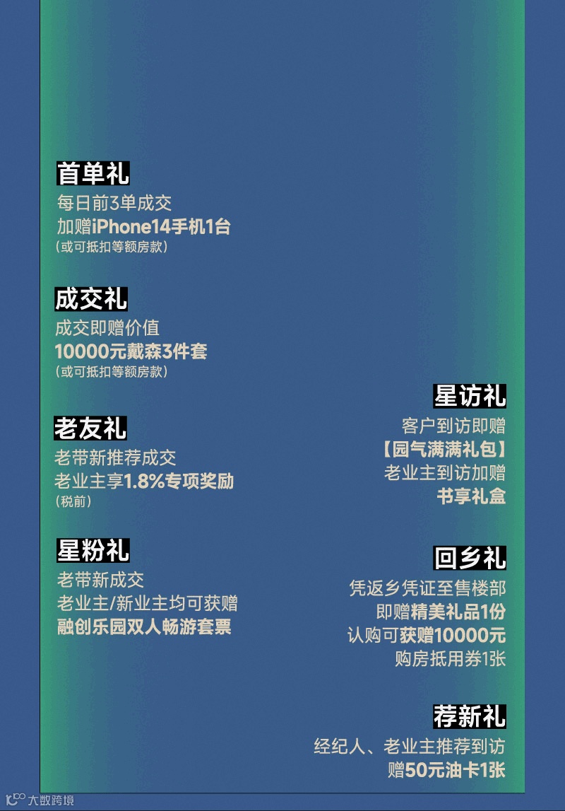6、本资料中[园气满满礼包]为价值20元定制元气森林抱枕或颈枕1个;书享礼盒价值50元,空气循环扇价值200元;凭机票、高铁票、汽车票等返乡凭证至售楼部即赠价值50元玻璃杯1个,认购可获赠1张10000元购房抵用券;10000元戴森3件套为戴森吹风机、吸尘器和空气扇各1台,iPhone14仅限每日成交前3单客户获得,所有礼品数量有限、以成交前后顺序为准进行发放,或可抵扣等额房款;本资料中所涉及的价格、折扣、付款方式等信息,因销售时间、户型楼栋、楼层、方位等不同有所差异,以实际签约信息为准;