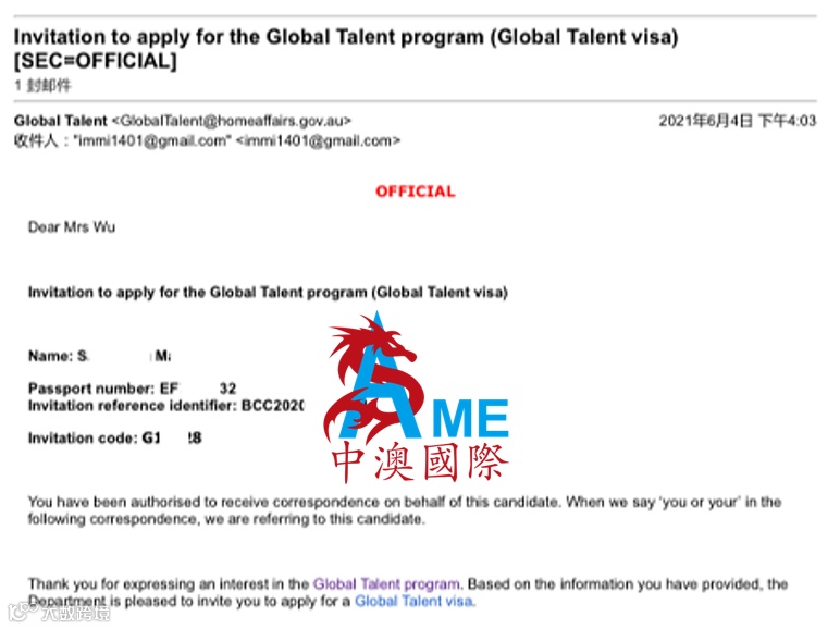 恭喜中澳国际客户M同学喜获GTI全球人才签证邀请!