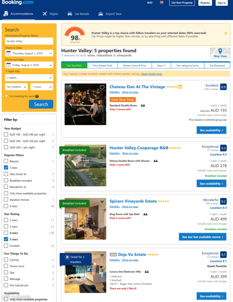 据Booking.com报道,猎人谷地区目前