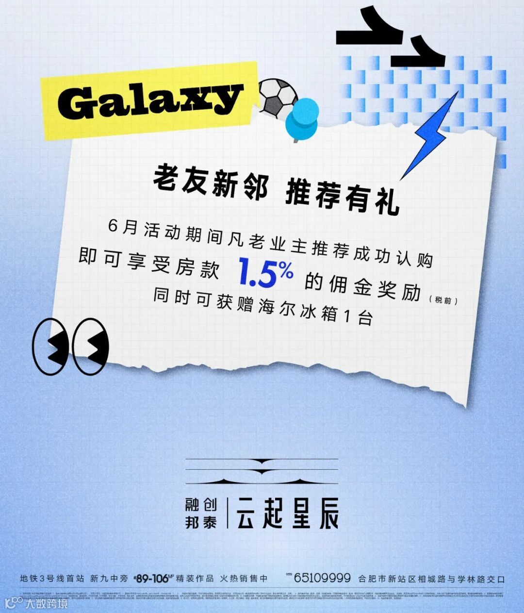 1、本项目推广名为“融创邦泰·云起星辰 ”,地名办核准名/备案名为“云起星辰小区”;开发公司为:“合肥邦恒置业有限公司 ”,预售许可证为“20211334号、20211333号、20220019号 ”;2、 本资料为要约邀请,不作为要约或承诺;买卖双方的权利义务 以双方签订的《商品房买卖合同》及其补充协议、附件等书面文件 为准;3、相关宣传内容(商业、交通、市政配套等)不排除因政府相关 规划、规定及岀卖人分期规划、未能控制等原因发生变化;本资料 所发布内容为2022年6月13日前的信息,岀卖人将不定期对宣传材料进行修改,敬请留意最新资料。4、教育配套信息来源于http://news.hf.house365.com/zx/20210715/029806718.html,学校的名称、建成时间、开办学性质、办学规模、学位设置、开学时间、招生条件、收费标准及招生区域划定等均未确定并存在调整可能,出卖人对此不作任何承诺,须以政府教育主管部门及校方的最新政策为准;5、交通规划设置、市政配套设置不排除因政府规划、政策规定及出卖人未能控制的原因而发生变化,本资料旨在提供相关信息,不代表着出卖人对此作出要约或承诺;6、本宣传资料中提到的商品房面积为商品房建筑面积;7、本活动最终举办或取消的权利归活动主办方所有;活动主办方有权对宣传资料内容进行修改,敬请留意最新资料;逾期未按活动要求提供报名信息或提供信息不完整的,视作自动放弃报名资格;8、“成功推荐”指推荐的新客户在限定时间内到访认购、网签并付清 全款的方视为成功推荐,奖励为税前金额。9、因工艺、材质和比例所限,效果图与实景存在一定差异,外立面、部分建筑、设施、园林景观、周边环境等信息后期可能存在变更,最终交付以政府部门核准文件及双方商品房买卖合同约定内容为准。一切未列举事项或更改,不再另行通知。10、礼品数量有限,先到先得。