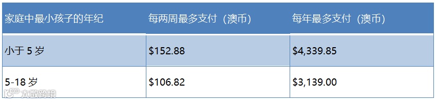 一个有孩子的家庭年收入不超过65,000澳元便可以领取该助养费,每两周约50-300澳元/人。金额取决于孩子的年龄、数量和家庭的总收入和财产。