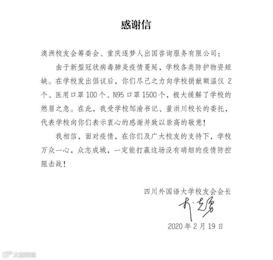 四川外国语大学校友会会长在收到我们的捐赠消息后,第一时间向我们表达了感谢!附: