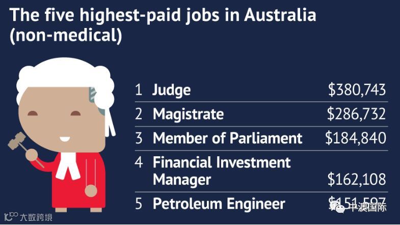 除了医生之外,年薪最高的就是大法官了,中位年薪高达38万澳币。排在第二的地方法院法官,中位年薪28.6万澳币。议会议员排在第三,但中位年薪已经降到了18.4万澳币。紧随其后的是金融投资经理,中位年薪在16.2万澳币。石油工程师以15.1万澳币的中位年薪排在第五。