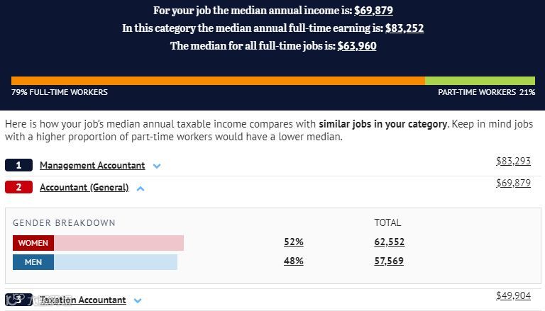 而最常见的会计移民职业Accountant (General),薪资中位数为$69,879。