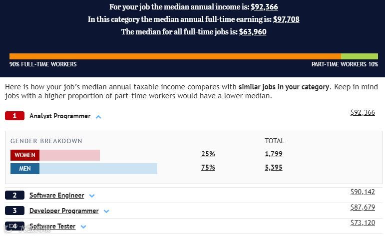 2613组别,程序分析员261311以$92,366的薪资中位数排在第112。软件工程师261313 以$90,142的中位数,紧跟其后。