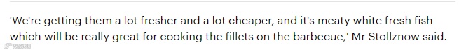 斯托尔兹诺先生表示,现在这类鱼更新鲜,也更便宜,而且是多肉的白色鲜鱼,在烧烤时做鱼片非常棒。