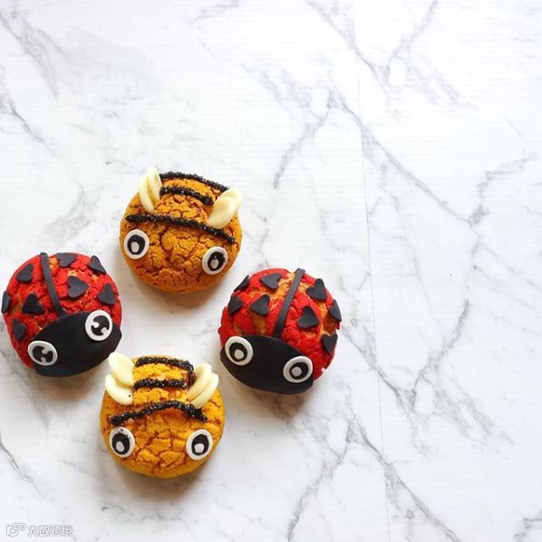 他们还不忘插上一根用黑巧克力制作的小触角,让蛋糕看起来像一只可爱的昆虫。