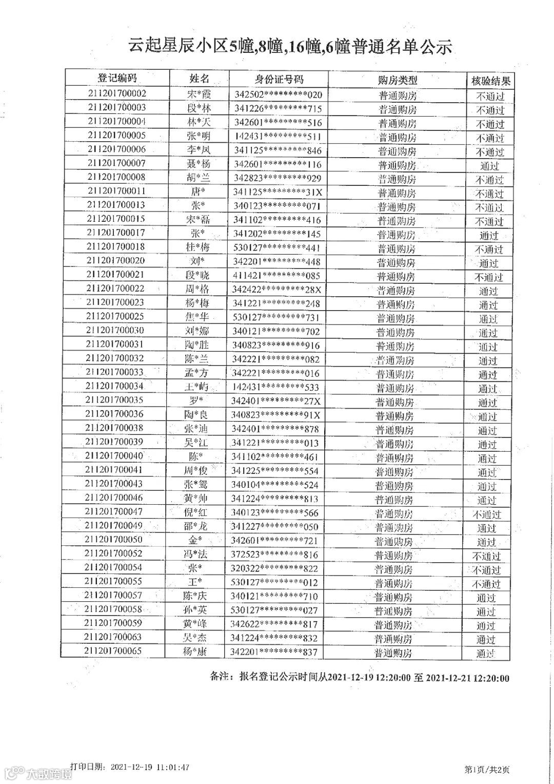 截止12月19日10:00,经系统比对去除重复登记 (含已登记其他项目,尚未满足首轮选房资格公示时间的),登记通过客户共44组,其中刚需客户18组,普通客户26组。