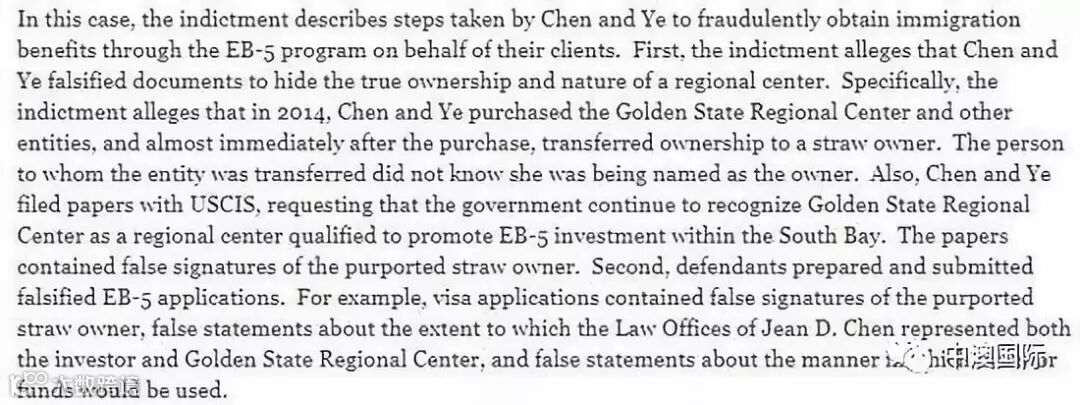 美国司法部和证券交易委员会在指控材料中就透露,在2014年的时候,为了从当时“红得发紫”的EB-5移民项目中也攫取巨额财富,陈丹虹和她的丈夫叶建云(Tony Jianyun Ye,音译)等人先是违规买下了一个供EB-5签证的申请者运作投资项目的“区域投资中心”(Regional Center),然后伪造文件将这个“区域投资中心”登记在了一个不知情的第三人的名下。