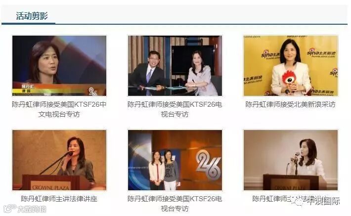同时,陈丹虹在自己律所的官方网站上也贴出了大量她出席各种讲座、接受美国华文媒体和中国媒体采访的图片,以及她宣称是美国国会颁发给她的各种“奖项”。根据其网站上的介绍,她不仅是《世界日报》、《星岛日报》、《侨报》、《文学城》、《北美新浪》、《华人工商》等媒体的移民专栏撰稿人,也因此经常成为美国NBC等主流媒体、中国主流媒体以及各大知名电视台、电台的采访对象。