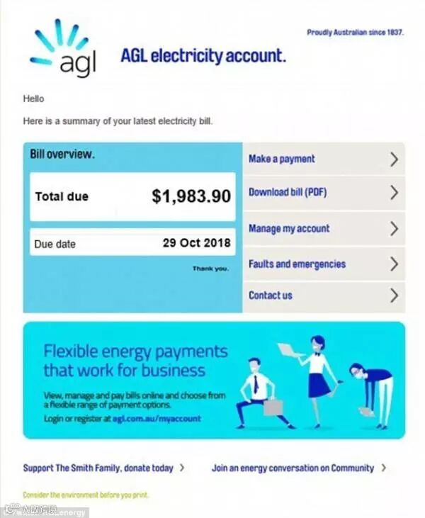 为了让更多人知道这个消息,能源公司AGL近日在Twitter上同样发布了这样一条警示信息:AGL已经接到了大量举报,有诈骗份子通过电子邮件发布假的电费账单,提醒大家注意鉴别真伪!