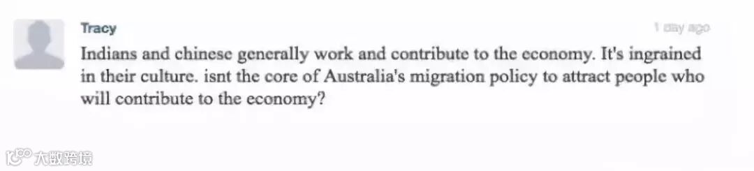 Tracy:中国人和印度人绝大多数都努力工作,建设经济,这是他们文化的一部分!澳大利亚的移民政策不就是为了吸引那些能努力建设经济的人么?