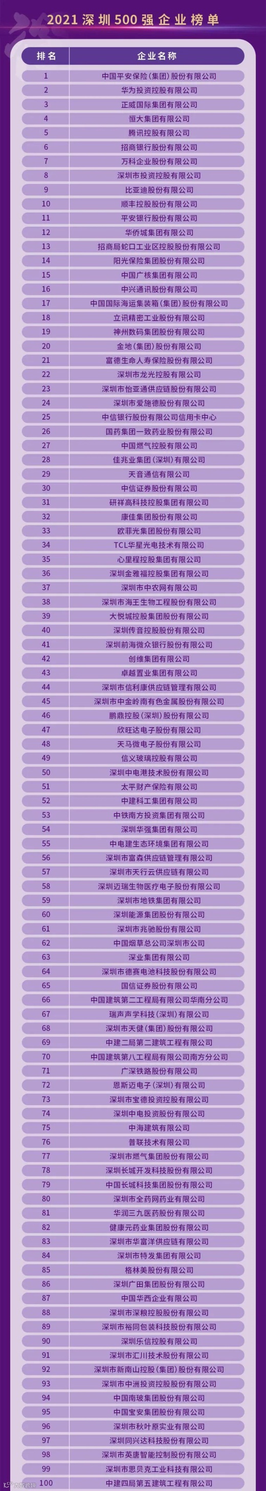 (注:“2021深圳企业500强榜单”的排序工作及《2021年深圳500强企业发展报告》的编撰工作,由深圳市企业联合会、深圳市企业家协会主办并联合国家人文社科重点研究基地一深圳大学中国经济特区研究中心和国际化智库一深圳市汉仑绿色发展研究院完成。)