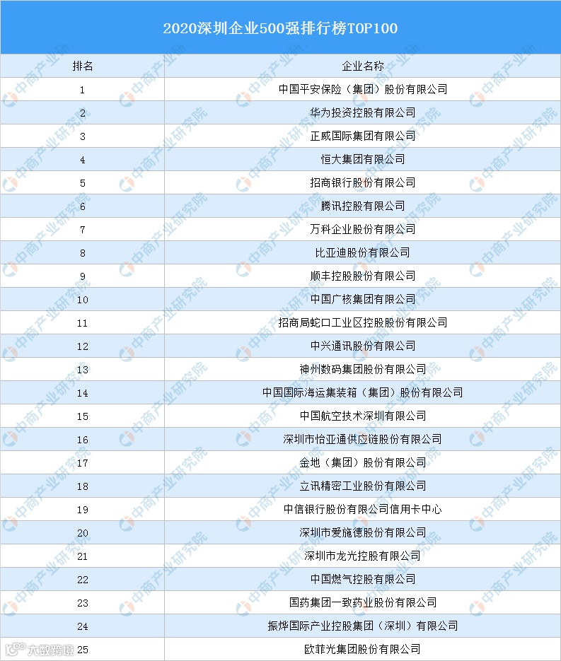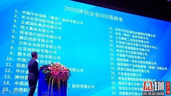2020年深圳500强企业发布 中国平安、招商银行、万科集团、比亚迪、顺丰控股、中国广核名列榜单前十