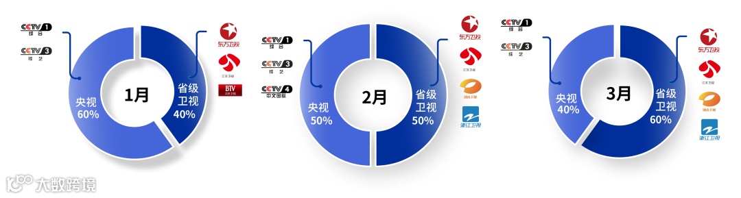 1-3月各大央卫视上榜综艺(TOP10)数量占比情况及当月CTV融屏传播力最佳综艺名称