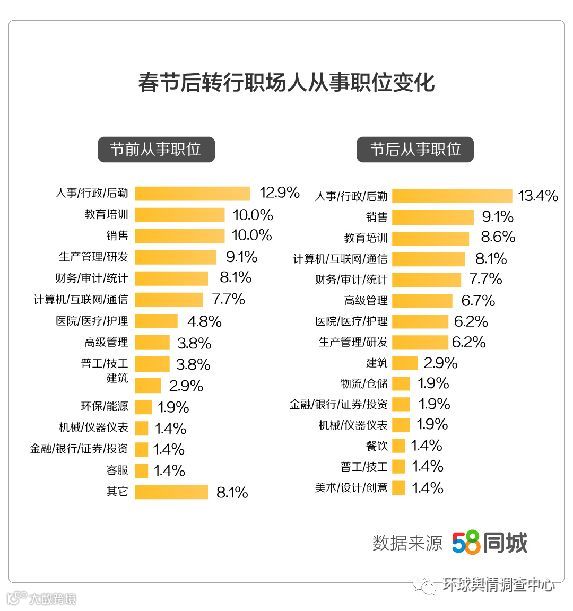 据58同城调研数据显示,春节前有转行计划的职场人在节后想从事的职位top3 分别是人事/行政/后勤、销售、教育培训。
