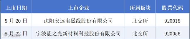 8月18日至8月24日期间,沈阳宏远电磁线股份有限公司、宁波能之光新材料科技股份有限公司挂牌上市。